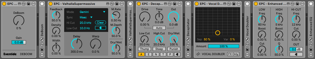 Each EPC Device comes with a pre-created preset for use in Live 12. Each preset is an effects rack containing the EPC Device and the VST plugin, already configured. So you don’t have to waste time with the VST plugin’s “Configure Mode.” Just load and use.