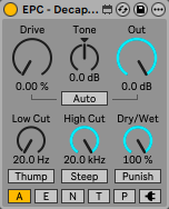 Every control in every VST plugin has been recreated using reverse engineering. This means that the controls of the EPC devices replicate the controls of the VST plugins in the same way (at least in 99% of cases). They display the actual value of the control, allowing manual entry of the value as on any Live device (by clicking and typing). They also replicate the curve of each control, so each control/knob behaves exactly like the VST plugin.