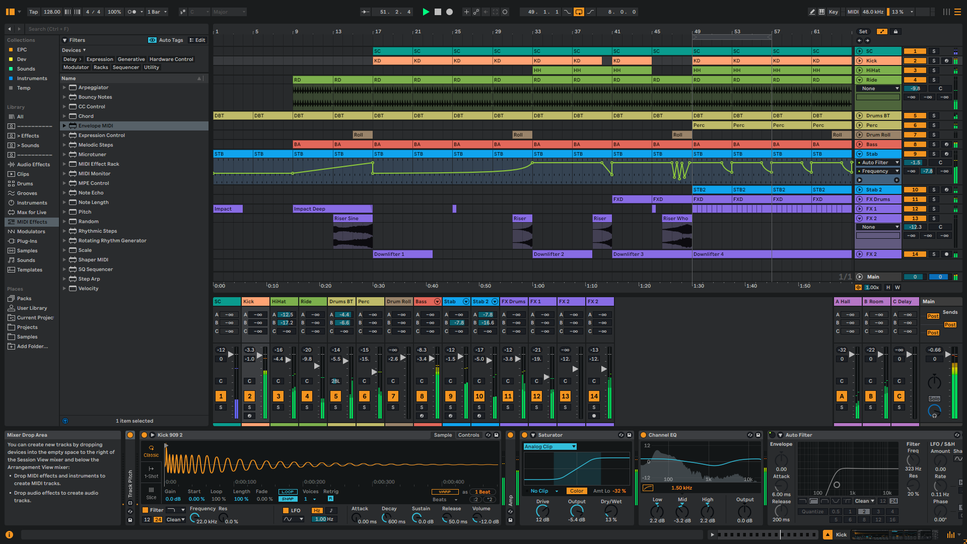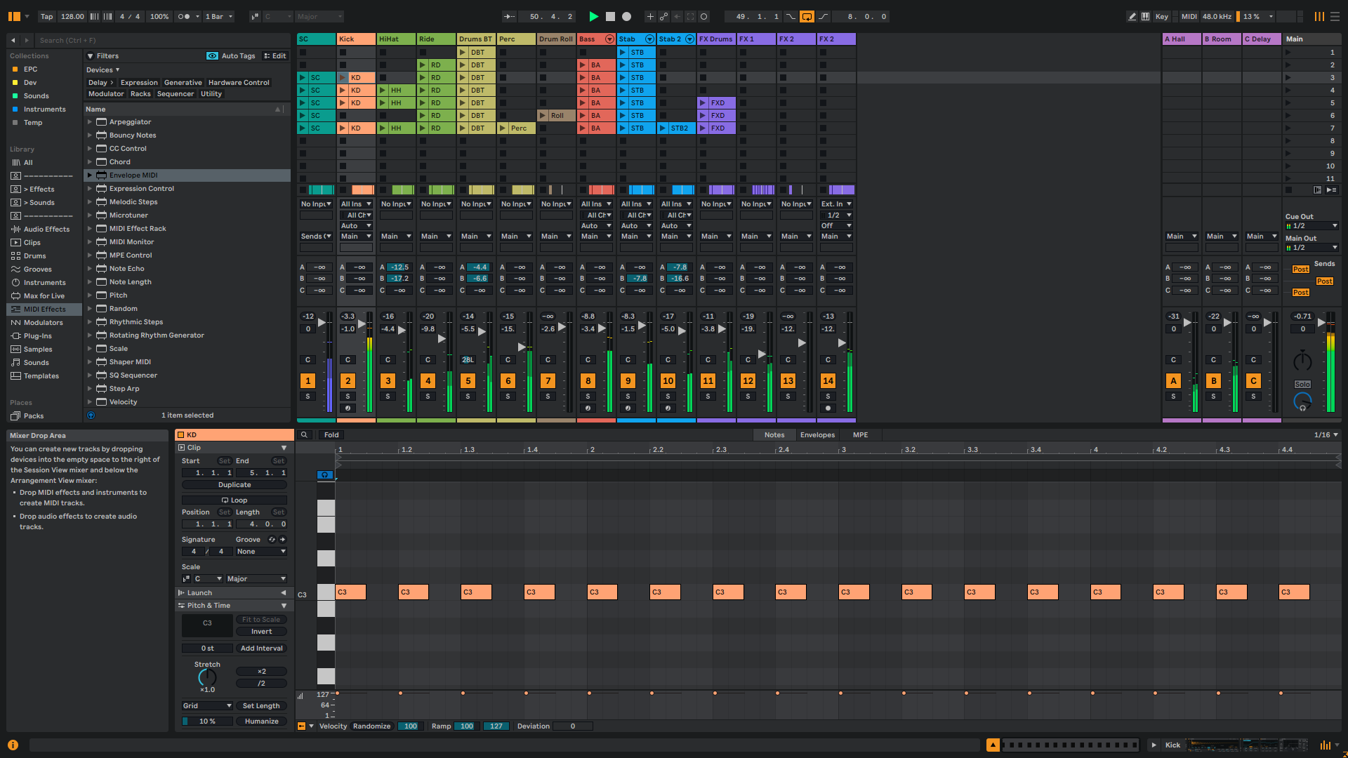 Dark theme for Ableton Live 12. In the screenshots the Grid Line Intensity of the Live settings is set to 50%.
