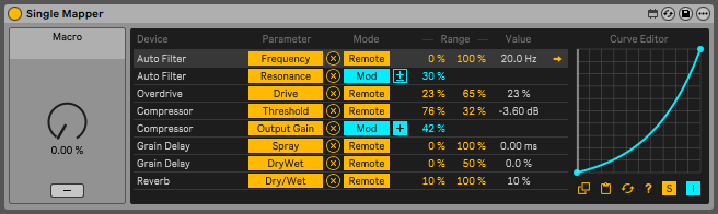 It can be controlled from a Macro Control on an effects rack, adding the custom curve feature to the Macro Control. In addition to the individual curve editor for each mapping, it also features a global curve editor that affects all mappings on the device.